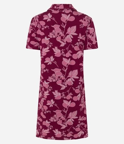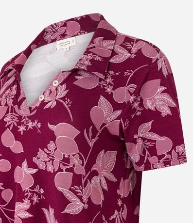 Ref: Camisola feminina confeccionada em viscose certificada. O produto tem golinha estilo polo, mangas curtas e estampa de ramos de figo.