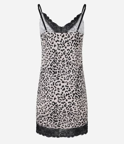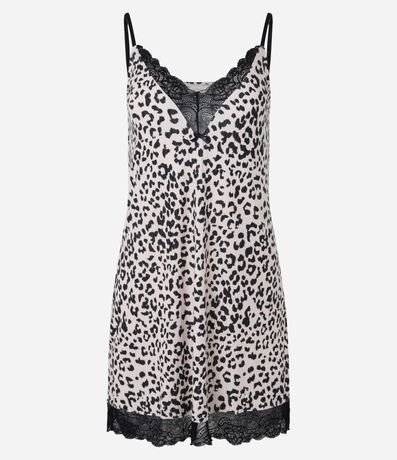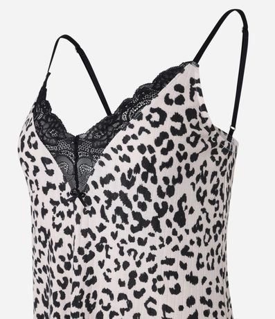 Camisola fresquinha com alças finas ajustáveis, decote V com renda e estampa de animal print onça.