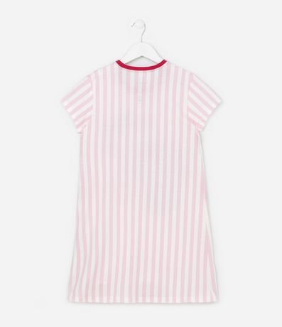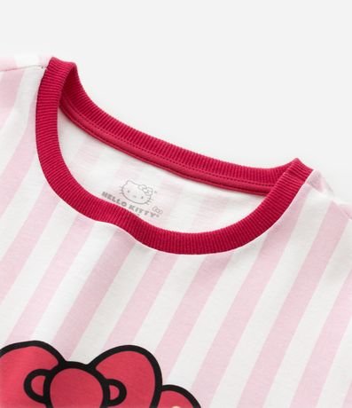 Ref: Camisola infantil confeccionada em algodão mais sustentável através de boas práticas ambientais, no modelo curto. Possui gola redonda, contrastante, manga curta, estampa listrada, personagem com balões e lettering Hello Kitty.