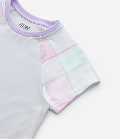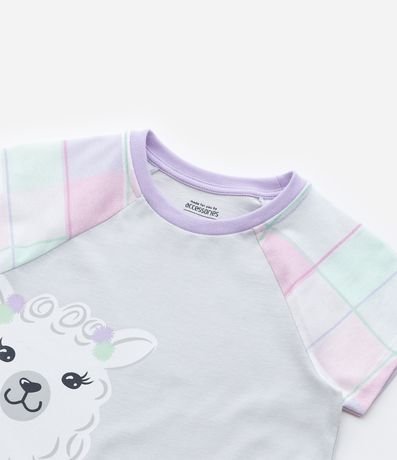 Camisola infantil confeccionada em malha de algodão mais responsável, com gola redonda e mangas curtas. Possui estampa de lhama, com pompons aplicados e mangas xadrez.