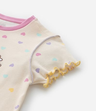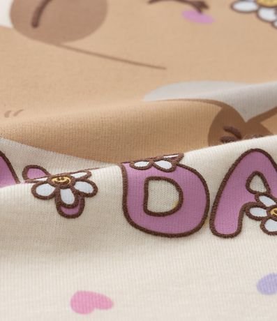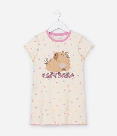 Ref: Camisola infantil confeccionada em algodão mais sustentável, com gola redonda, mangas curtas, frufru na barra e estampa de capivarinha com lettering "Capybara".
