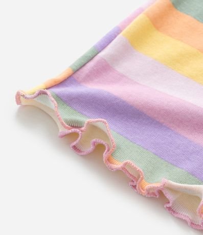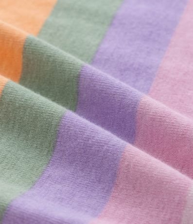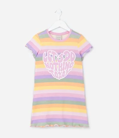 Ref: Camisola infantil confeccionada em algodão mais sustentável, com gola redonda, mangas curtas, frufru na barra e estampa de listras com lettering "Let's do nothing today" em formato de coração.