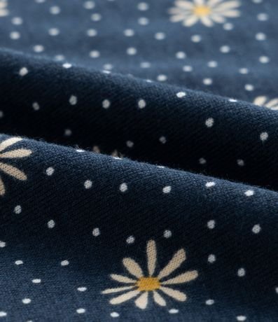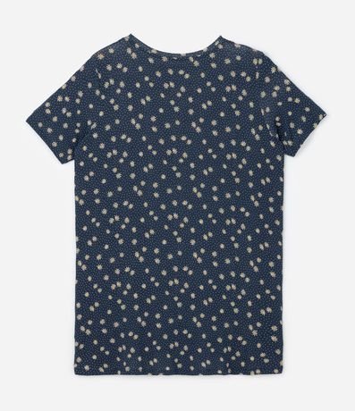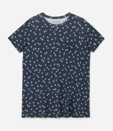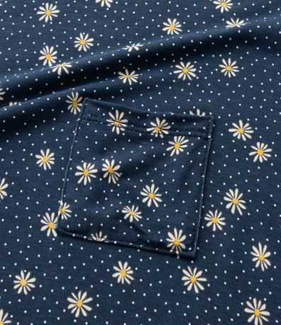 Camisola de viscolycra estilo camisetão. A peça tem gola redonda, mangas curtas, estampa de margaridas e bolsinho no peito.