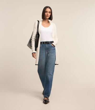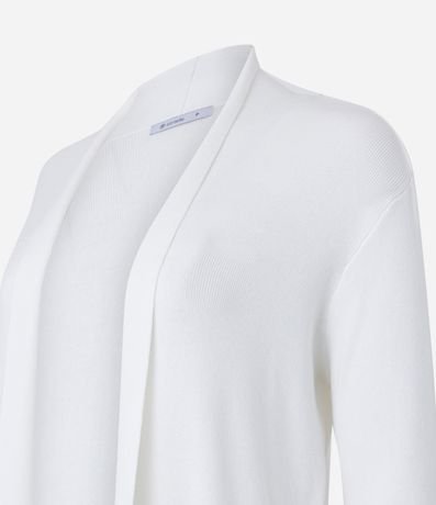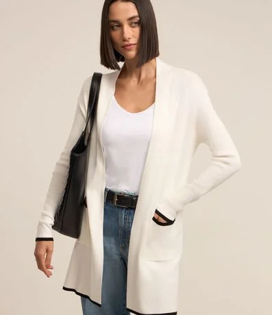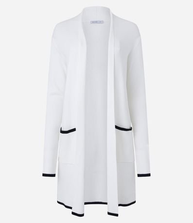 Ref: Cardigan alongado feminino, confeccionado em tricô, com abertura total frotal, mangas longas e bolsos grandes. A peça possui também detalhes contrastantes nos bolsos e barras.