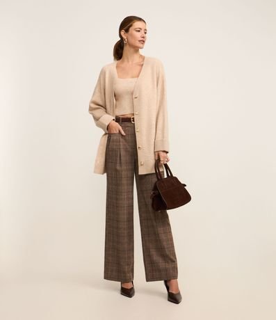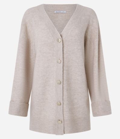 Ref: Cardigan alongado com abotoamento frontal, fundo mesclado e decote V. A peça de tricô pesado possui lã natural em sua composição, colaborando para uma peça quentinha e ideal para dias mais frios.
