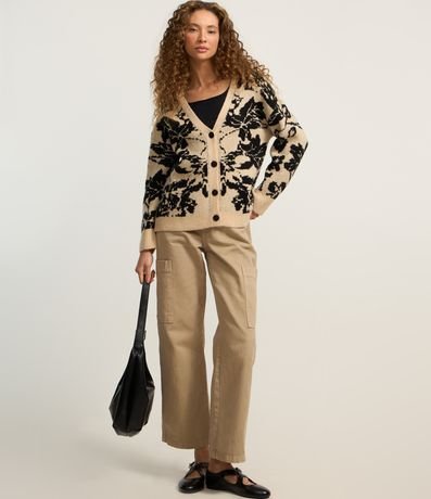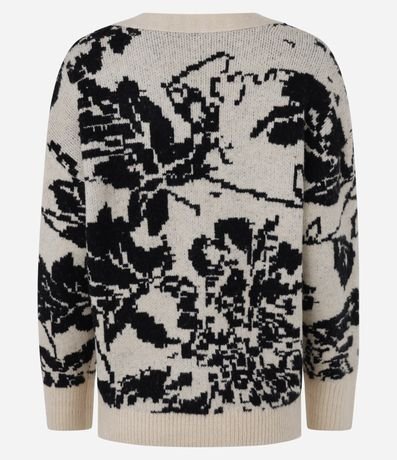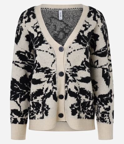 Ref: Cardigan alongado, confeccionado em tricô pesado, abotoamento frontal, punhos e barra canelados com estampa floral.
