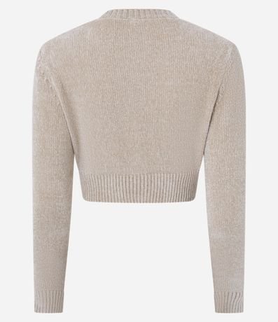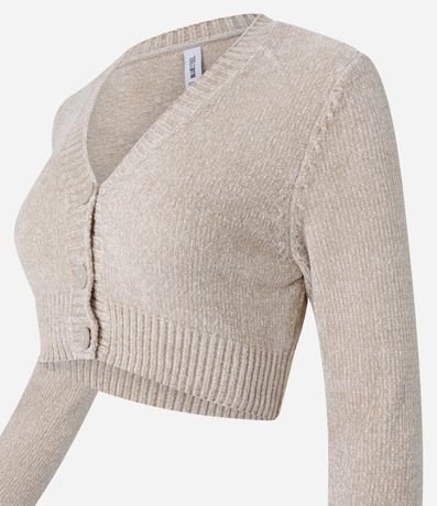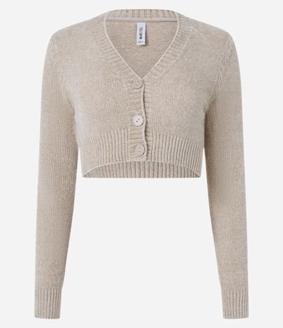 Cardigan cropped feminino com decote em v, abotoamento frontal, manga longa.