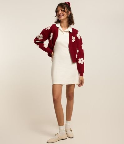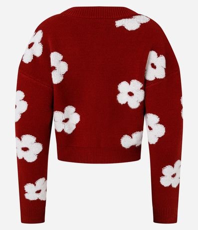 Ref: Cardigan cropped com manga longa, em jacquard, abertura total e com florzinhas atoalhadas.