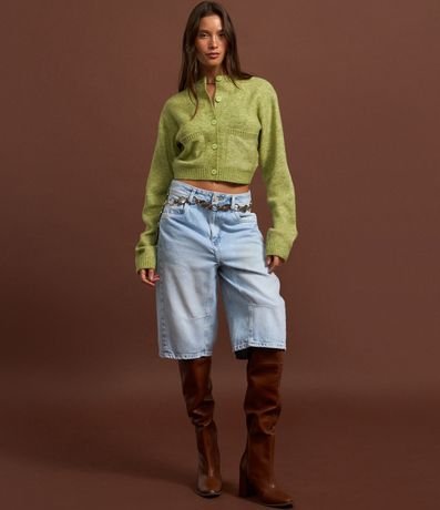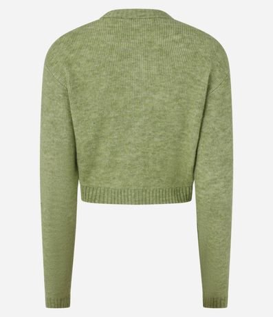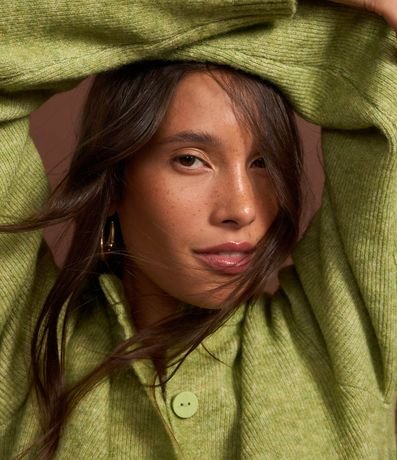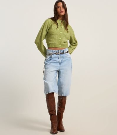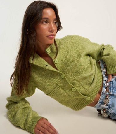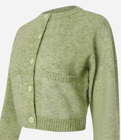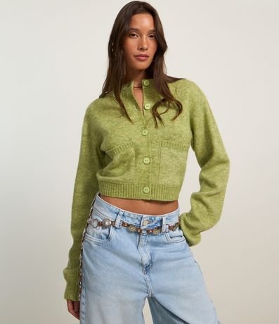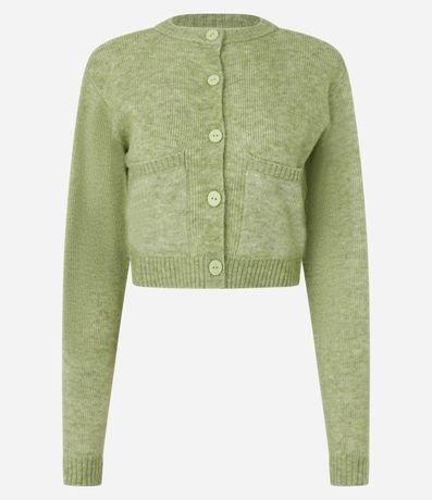Ref: Cardigan cropped com manga longa, fechamento por botões frontais, bolsinhos e barra canelada.