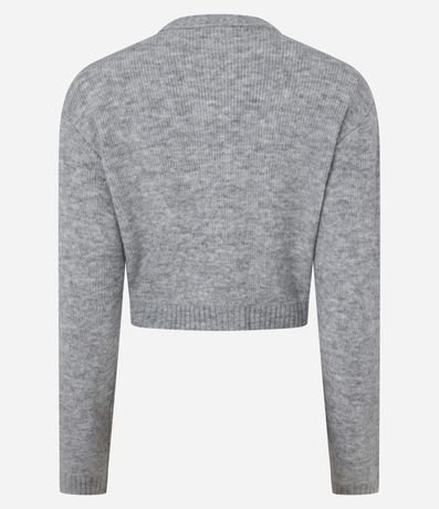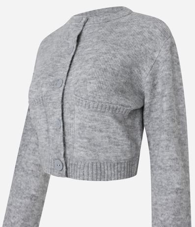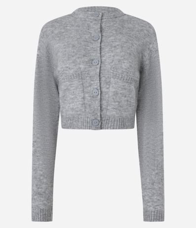 Ref: Cardigan cropped com manga longa, fechamento por botões frontais, bolsinhos e barra canelada.