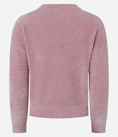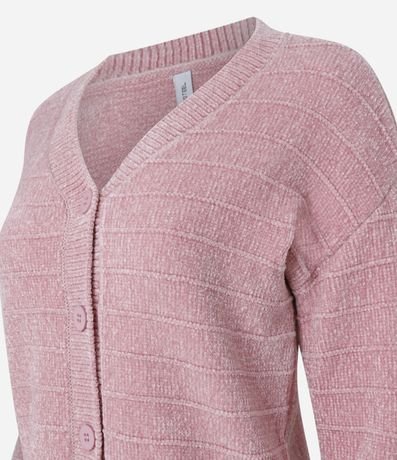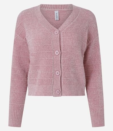Ref: Cardigan curto confeccionado em chenille com textura em listras e abotoamento frontal.