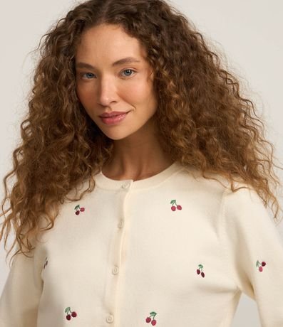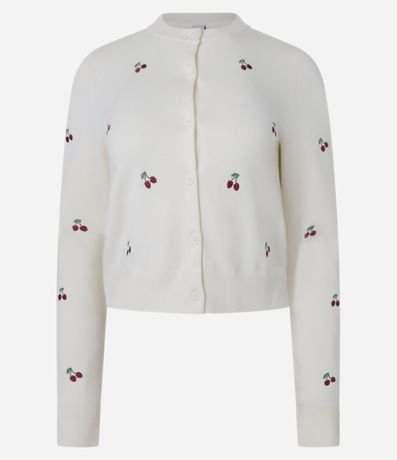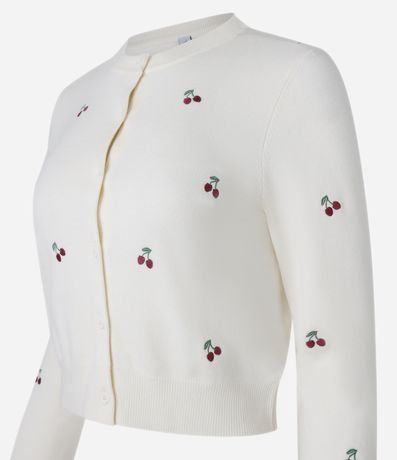 Ref: Cardigan curto confeccionado em tricô leve, abotoamento frontal e bordados de cerejinhas.