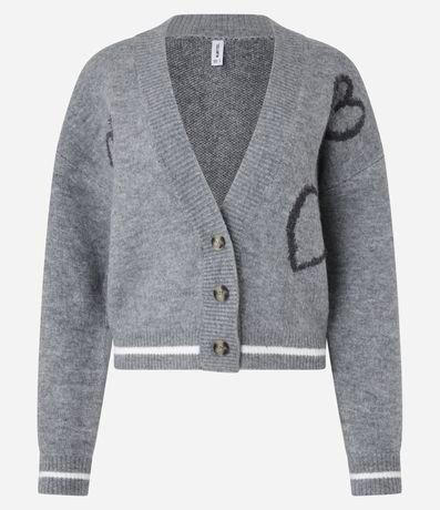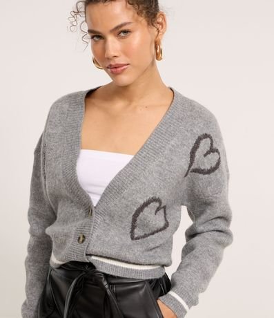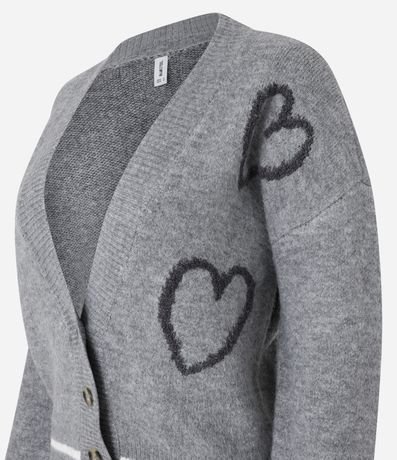 Cardigan curto, confeccionado em tricô pesado com viscose certificada, abotoamento frontal e com estampa de corações na lateral.