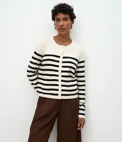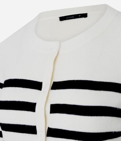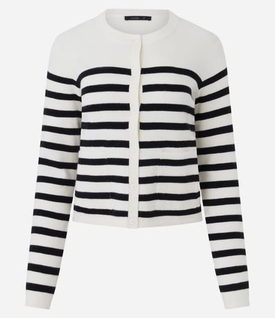 Cardigan feminino em tricô confeccionado em viscose certificada mais sustentável. Possui modelo curto, com padronagem listrada em toda a peça, gola redonda, fechamento frontal por botões, mangas longas e acabamento canelado nos punhos e barra. Estrutura maleável e macia, oferecendo caimento confortável para uso diário.