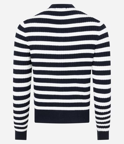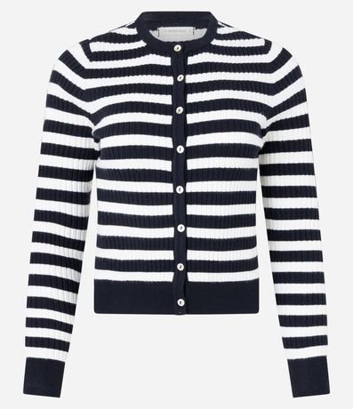 Cardigan em tricô, com gola redonda, mangas longas, abotoamento frontal e estampa listrada.