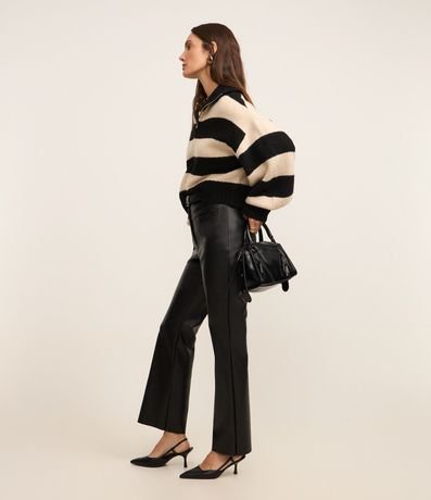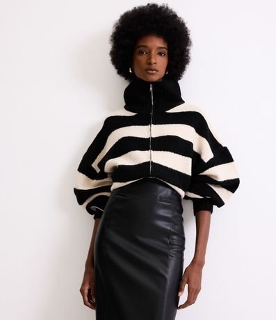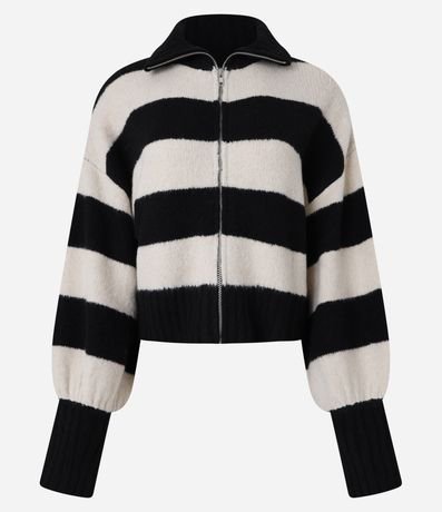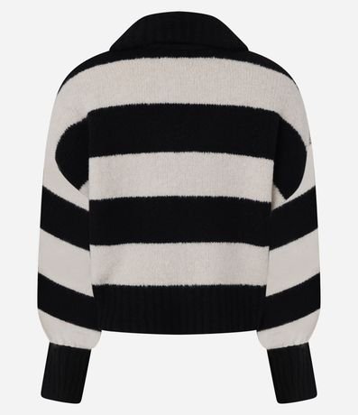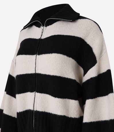 Ref: Cardigan confeccionado em tricô com colarinho na gola. O agasalho dispõe de punhos largos ajustados e listras horizontais em blocos largos.