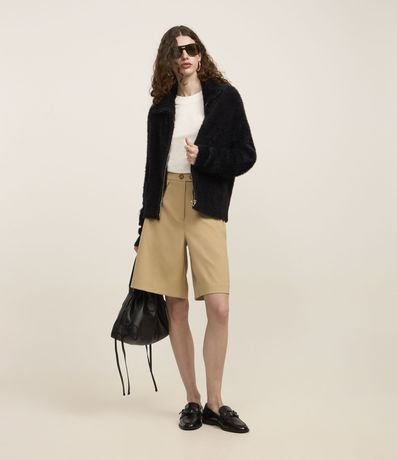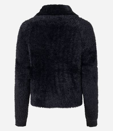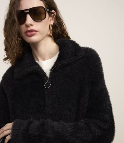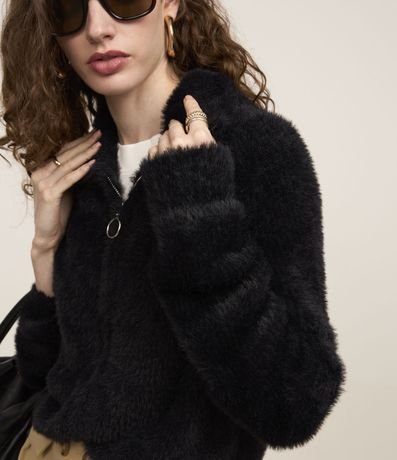 Cardigan com golinha alta, fechamento por zíper frontal e confeccionado com pelos artificiais, ornando a peça quentinha e aconchegante para os dias frios.