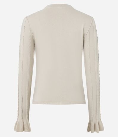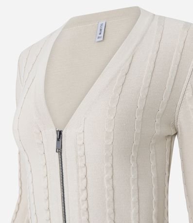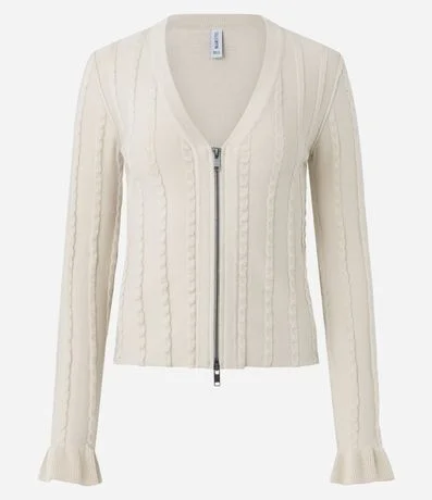 Ref: Cardigan em tricô texturizado com zíper frontal, caimento confortável e visual moderno. Possui mangas longas com babado nos punhos e decote em V que valoriza o look. Peça versátil para compor camadas no dia a dia, confeccionado em algodão de certificado BCI.