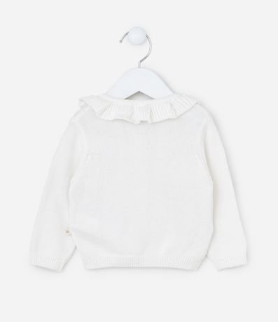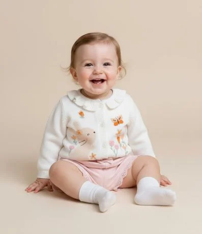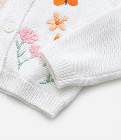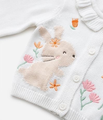 Ref: Cardigan infantil confeccionado em tricô, de material e processo mais sustentável. Possui babadinho na gola, mangas longas, fechamento por botões e bordado de coelho com florzinhas.
