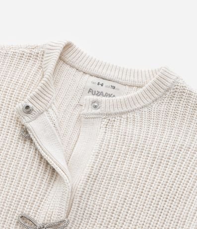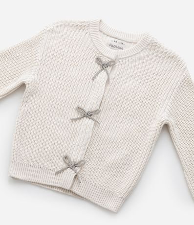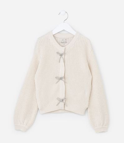 Cardigan infantil confeccionada em tricô quentinho, com mangas longas e fechamento frontal com lacinhos brilhantes aplicados.