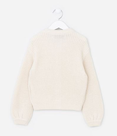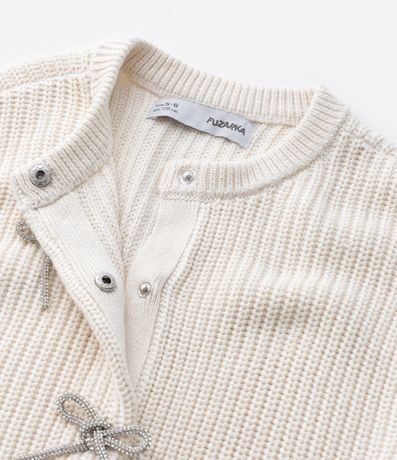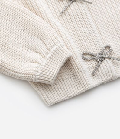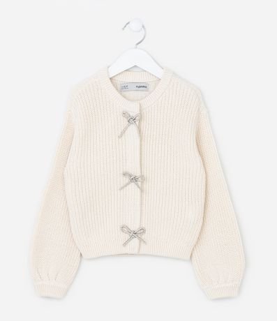 Cardigan infantil em tricô pesado confeccionado em algodão certificado BCI e boas práticas ambientais. Possui gola redonda, mangas longas e três laços brilhantes aplicados na frente, com fechamento interno por botões de pressão, garantindo charme e conforto para compor diversos looks.