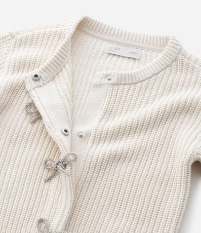 Cardigan infantil confeccionado em tricô pesado de algodão certificado BCI, com gola redonda e mangas longas. Possui três laços aplicados em strass na parte frontal, abertura com botões de pressão internos e acabamentos canelados que reforçam a estrutura.