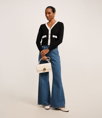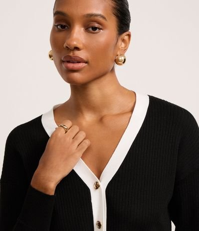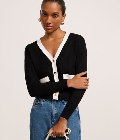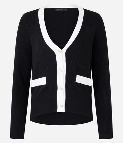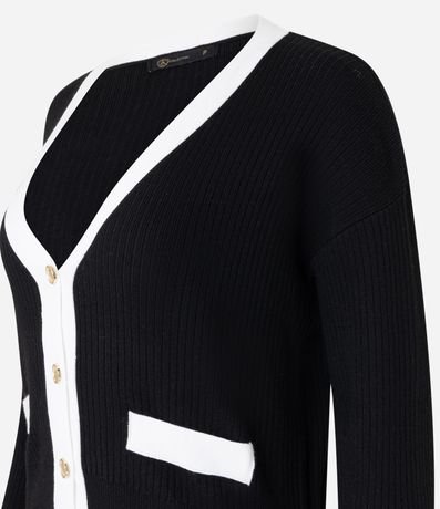 Ref: Cardigan confeccionado em tricô com caimento leve, com decote V e botões frontais metalizados pra fechamento, O casaco conta com malha texturizada, bolsos falsos, gola e vista contrastantes e barra larga com textura canelada.