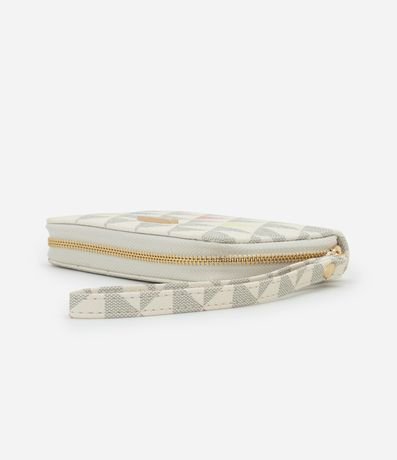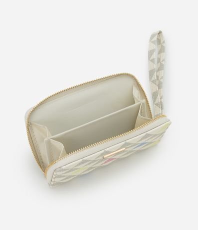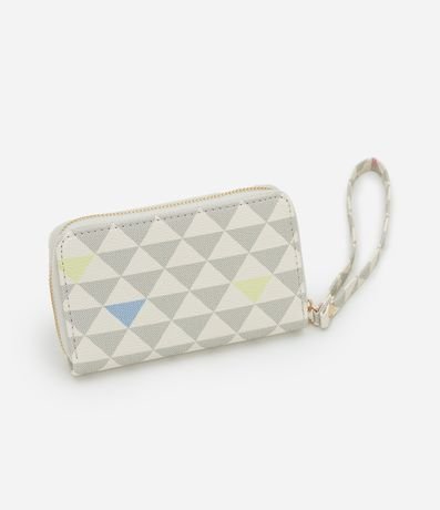 Ref: Carteira feminina pequena confeccionada em material sintético, com fechamento de zíper, estampa triangular, alça de mão.