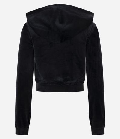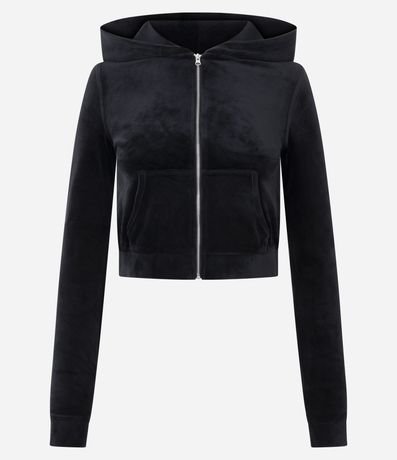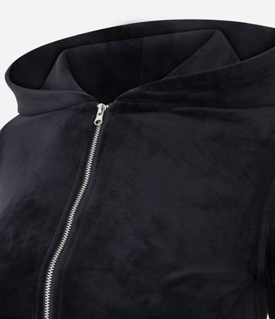 Casaco aberto feminino confeccionado em plush. Possui gola com capuz, manga longa, fechamento por zíper e bolsos.