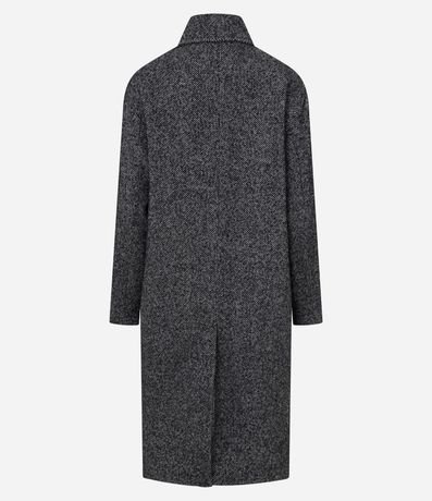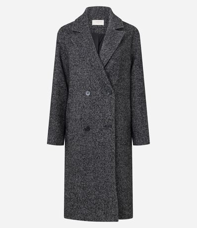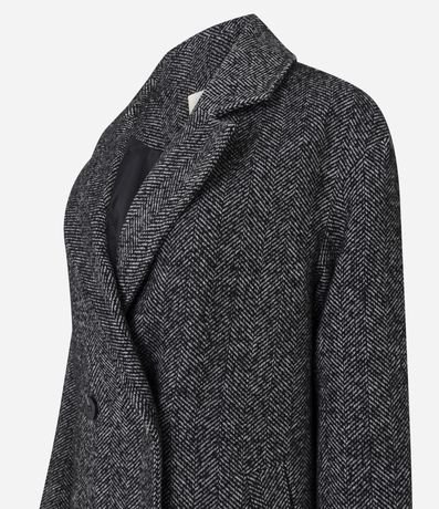 Casaco feminino alongado com padronagem espinha de peixe. Possui lapelas amplas, fechamento com botões, mangas retas e o caimento estruturado reforçam o visual elegante.