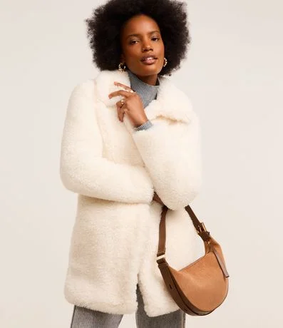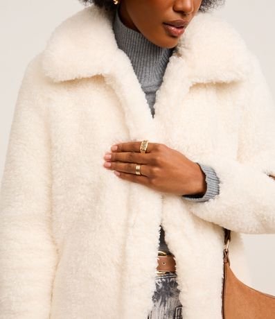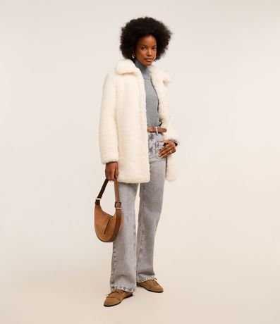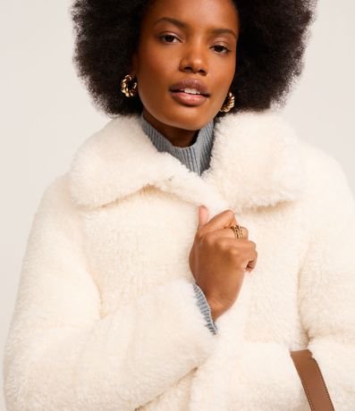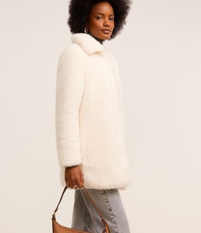 Ref: Casaco de comprimento alongado com pelos artificiais aplicados em todo o tecido. Possui mangas longas e fechamento frontal.