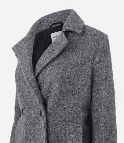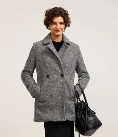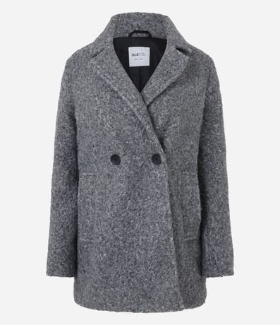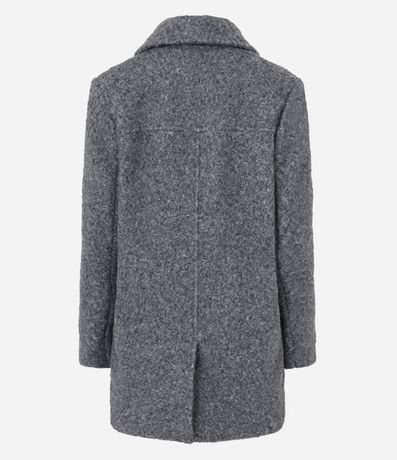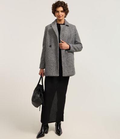 Casaco alongado feminino, confeccionado em polyvelour, com gola lapela, abotoamento frontal e bolsos. A peça também conta com superfície em textura boucle.