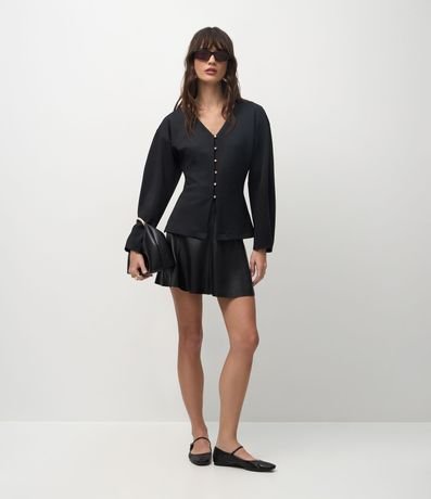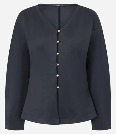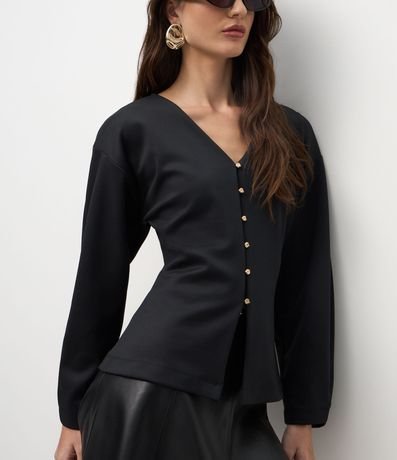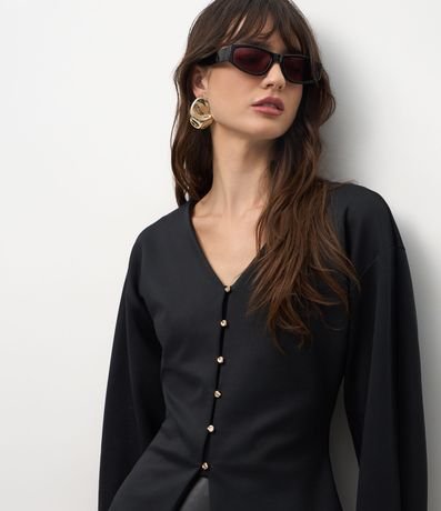 Ref: Casaco feminino em malha ponto roma, modelagem ampla. Possui caimento estruturado, decote V profundo e fileira de botões metálicos delicados. As mangas longas têm volume, enquanto as costas apresentam recorte central.