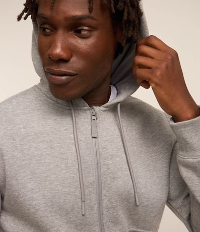 Casaco básico, em moletom forrado, capuz com cordão e zíper frontal para fechamento.