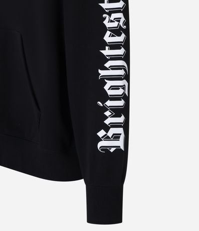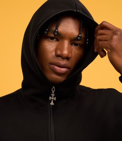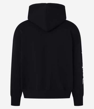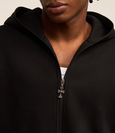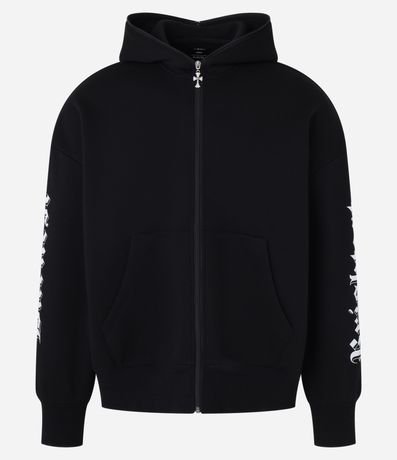 Ref: Casaco boxy em fleece, confeccionado com material mais sustentável. Peça com capuz, abertura frontal em zíper com pingente de cruz, estampa lettering nas mangas, punho ajustado e bolsos.