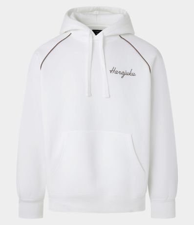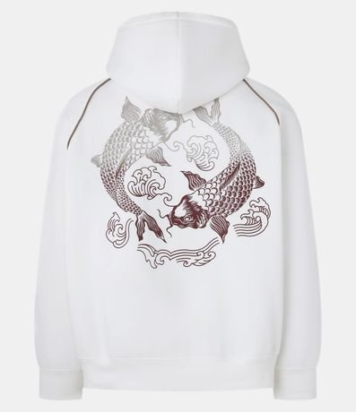 Ref: Casaco confeccionada em fleece com felpa mais sustentável no modelo boxy, possui capuz com cordão ajustável, bolso canguru, manga longa, punhos ajustados, estampa lettering frontal e estampa degradê de peixes orientais nas costas.