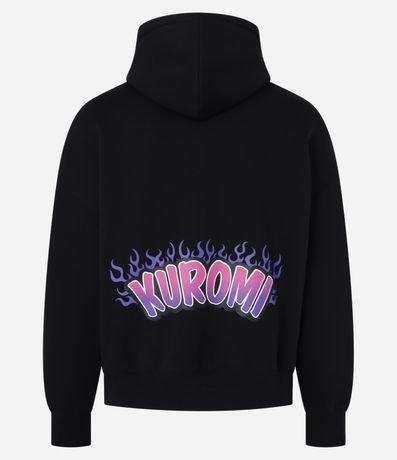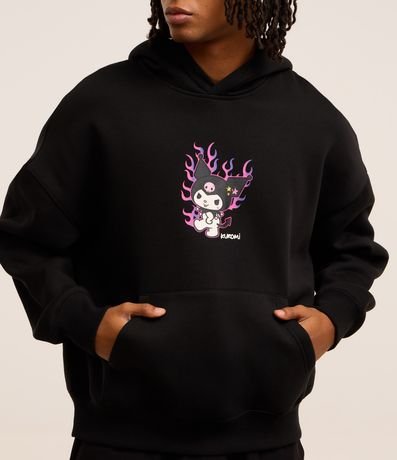 Ref: Casaco fechado masculino confeccionada em algodão mais sustentável, no modelo boxy. Possui capuz, manga longa, bolso canguru, barras ajustadas, estampa lettering e estampa do Kuromi Hello Kitty.