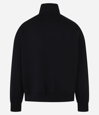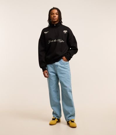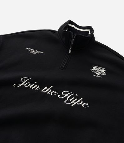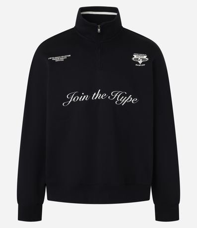 Ref: Casaco fechado masculino confeccionada em moletom com felpa mais sustentável no modelo boxy, possui gola alta, com zíper, manga longa, com punhos ajustados, estampa localizada e bordado lettering "Join the hype".