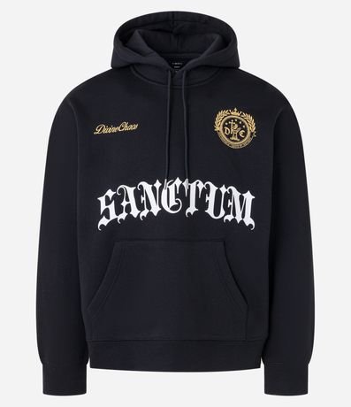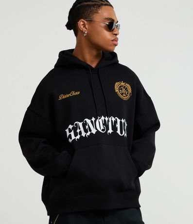 Casaco Boxy em Moletom com Felpa, capuz ajustável, bolso canguru, estampa Lettering e bordados frontais.