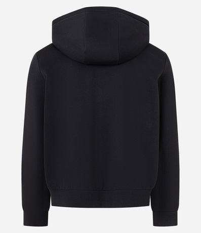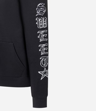 Ref: Casaco boxy em fleece, confeccionado com material mais sustentável. Peça com capuz, abertura frontal em zíper, estampa lettering nas mangas, punho ajustado e bolsos.