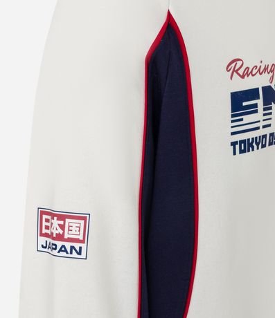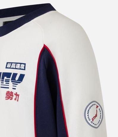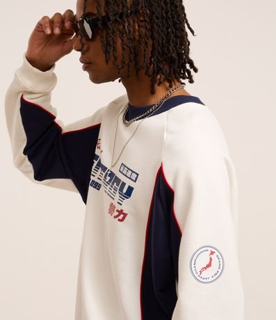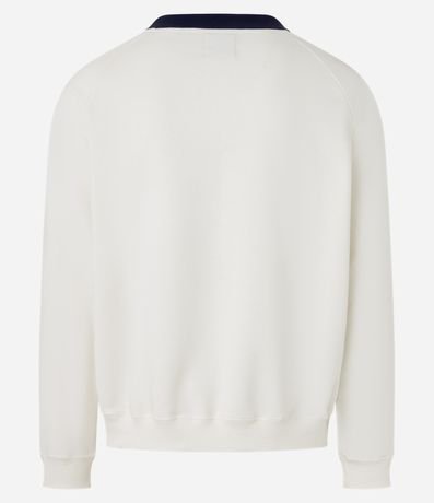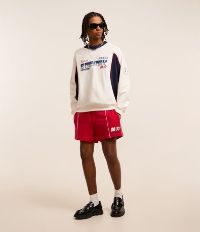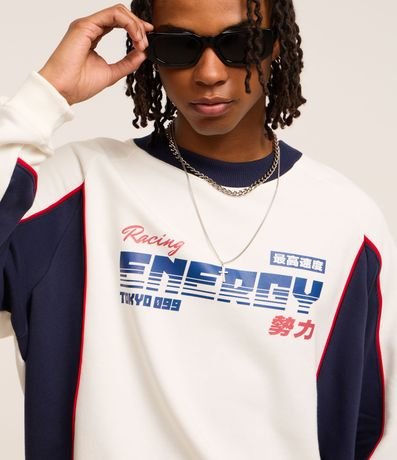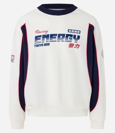 Ref: Casaco fechado masculino confeccionada em algodão mais sustentável com boas práticas ambientais, no modelo boxy. Possui gola redonda, manga longa, estampa lettering, detalhes contrastantes e barras ajustadas.