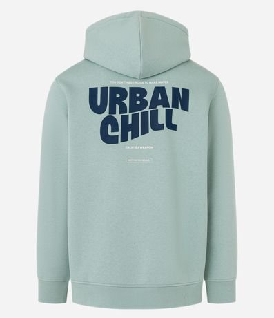 Casaco Comfort em Moletom com Felpa e estampa Urban Chill em letras na frente e costas, capuz com cordão ajustável, bolso canguru e barras marcadas para mais conforto.