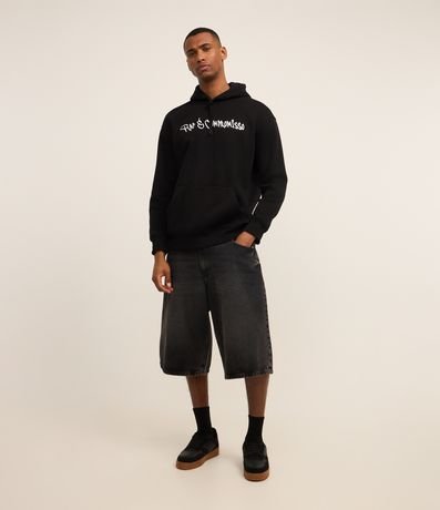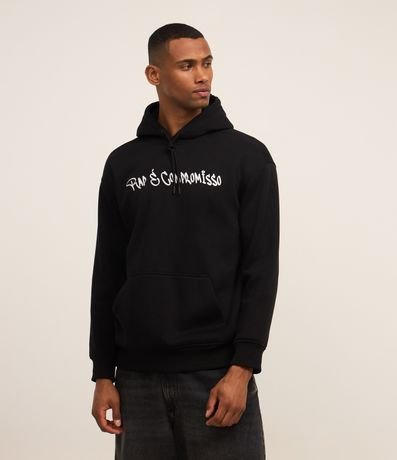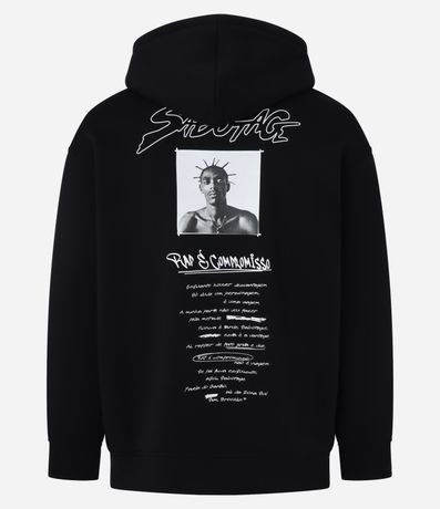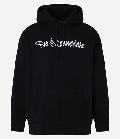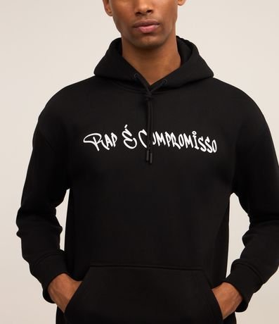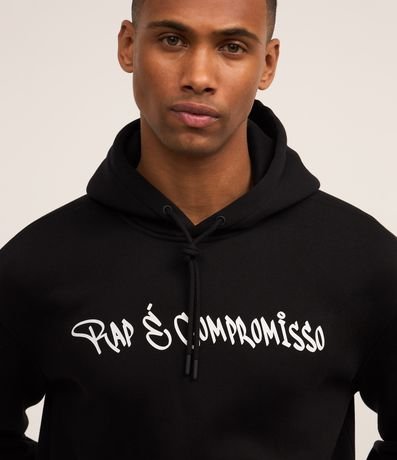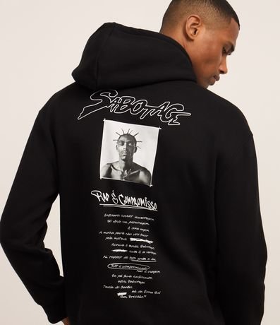 Ref: Casaco masculino confeccionado em material mais sustentável, com capuz, manga longa ajustada. Peça no modelo comfort com estampa frontal lettering Rap é Compromisso, e nas cotas estampa em homenagem ao rapper Sabotage, um photoprint e lettering com referencias á canção.