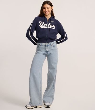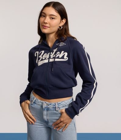 Ref: Casaco cropped feminino em moletom com felpa, capuz e zíper frontal. Estampa lettering Boston, toque macio e algodão sustentável. Ideal para looks confortáveis e estilosos.