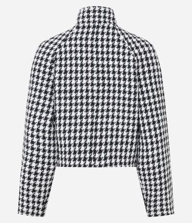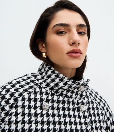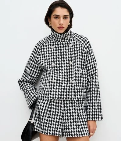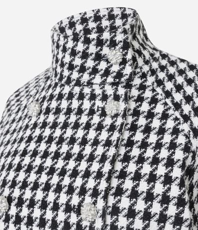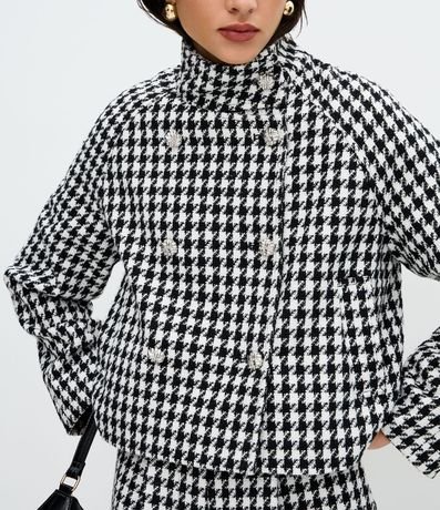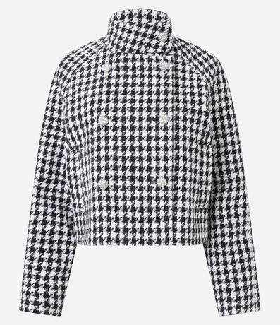 Ref: Casaco feminino em poliéster com estampa pied de poule, comprimento curto e modelagem estruturada. Possui fechamento transpassado, gola alta e mangas longas.