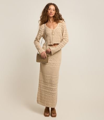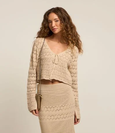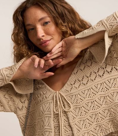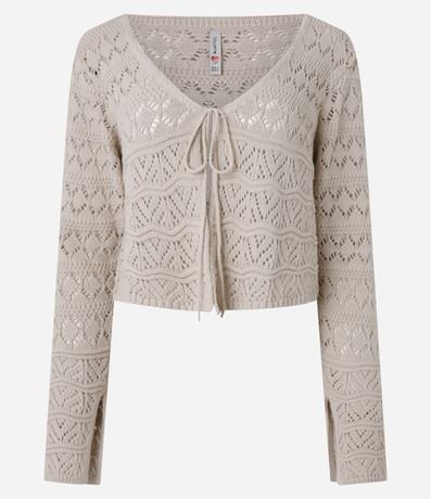 Ref: Casaco curtinho confeccionado em tricô leve, mix de pontos e com amarração na parte da frente.