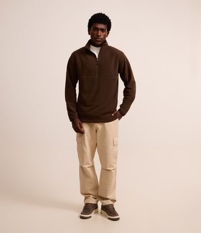 Casaco masculino confeccionado em fleece, sendo mais quentinho nos dias frios, gola redonda com zíper e manga longa.