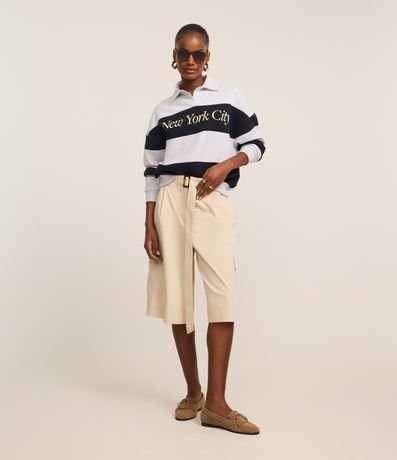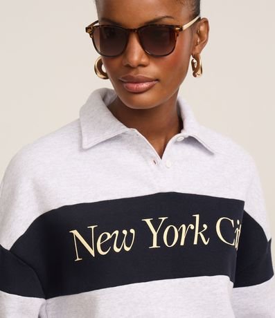 Ref: Casaco feminino confeccionado em moletom com forro fleece, de material mais sustentável. Possui gola polo, fechamento por botões, mangas longas, estampa listrada com lettering "New York City".