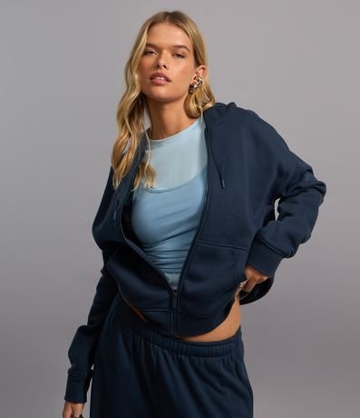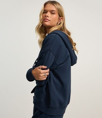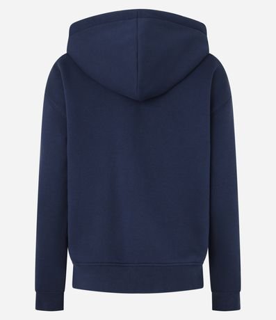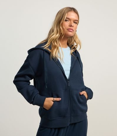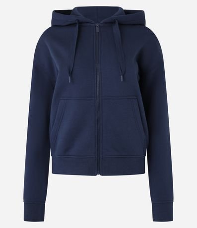 Ref: Casaco básico confeccionado em moletom peluciado, com capuz e bolso canguru. Possui cordão para ajuste no capuz e fechamento frontal por zíper.
