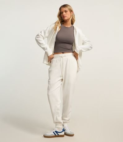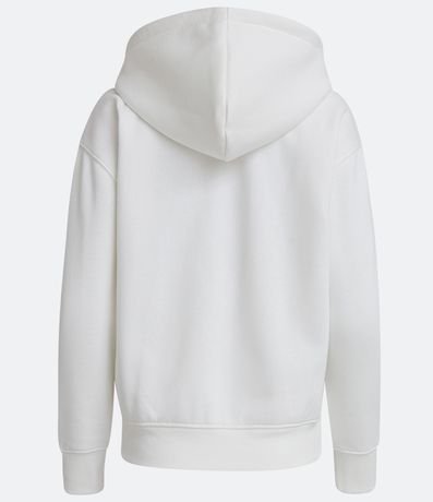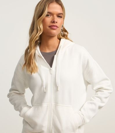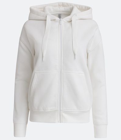 Casaco básico confeccionado em moletom peluciado, com capuz e bolso canguru. Possui cordão para ajuste no capuz e fechamento frontal por zíper.